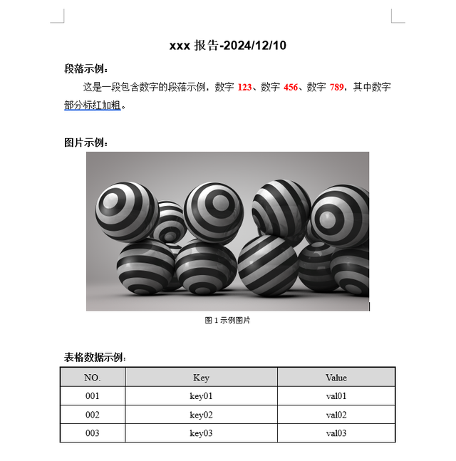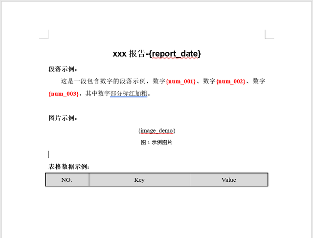 import reimport timefrom docx import Documentfrom docx.shared import Inches, RGBColorfrom docx.enum.text import WD_ALIGN_PARAGRAPHdef format_number_red_bold(paragraph): """ 将段落中的数字标红加粗 整体的思路是把段落重新拆分为文本和数字,然后重新创建新的Run对象,针对数字的样式进行修改 """ # 正则表达式匹配数字 pattern = re.compile(r'\d+') # 记录拆分的段落文本和数字Run对象 new_runs = [] # 当前处理的文本起始位置 start = 0 # 找到所有数字的位置 for match in pattern.finditer(paragraph.text): number_start, number_end = match.span() # 如果数字前面有文本,添加一个新的Run对象保存数字前的文本 if number_start > start: text = paragraph.text[start:number_start] new_runs.append((text, "text")) # 创建包含数字的Run对象,并设置样式 text = paragraph.text[number_start:number_end] new_runs.append((text, "digit")) # 更新当前处理的文本起始位置 start = number_end # 段落末尾的文本 new_runs.append((paragraph.text[start:], "text")) # 清空段落 paragraph.text = "" # 重新组装段落并将数字的样式改为标红加粗 for text, style in new_runs: run = paragraph.add_run(text) if style == "digit": run.font.color.rgb = RGBColor(255, 0, 0) # 红色 run.font.bold = True # 加粗def generate_report_from_template(template_path, output_path, report_data): """ 根据提供的数据更新Word模板并生成报告文件 :param template_path: 模板文件 :param output_path: 输出报告文件 :param report_data: 包含要更新的数据字典, """ # 打开模板文档 doc = Document(template_path) # 遍历模板文档中的段落 for para in doc.paragraphs: # 遍历检查段落中是否有需要替换的占位符 for placeholder, new_text in report_data.items(): # 排除图片占位符 if not placeholder.startswith('image_'): # 如果当前段落文本包含占位符,则替换为占位符对应的文本 if f'{{{placeholder}}}' in para.text: para.text = para.text.replace(f'{{{placeholder}}}', new_text) # 段落被占位符替换后样式会丢失,遍历段落设置数字的样式为标红加粗 for para in doc.paragraphs: # 判断是否是需要对数字标红加粗的段落 if para.text.startswith("这是一段包含数字的段落示例"): # 重新将需要标红加粗的数字进行样式修改 format_number_red_bold(para) # 更新报告表格数据 for table in doc.tables: # 获取表格第一行第一列标题,作为判定表格的依据 th0 = table.rows[0].cells[0].text # 遍历报告数据中的数据 for thead, tdata in report_data.items(): # 如果第一列标题和报告数据中的key相同,则表明该表格需要更新 if th0 == thead: # 记录新增表格的行 new_added_rows = [] for _ in tdata: new_added_rows.append(table.add_row()) # 遍历新增的行 for index, new_row in enumerate(new_added_rows): # 遍历每一行的单元格 for cell_idx, cell in enumerate(new_row.cells): # 取表格对应的数据项设置为单元格的文本 cell.text = tdata[index][cell_idx] # 设置单元格样式为居中 for p in cell.paragraphs: p.paragraph_format.alignment = WD_ALIGN_PARAGRAPH.CENTER # 更新报告图片 for para in doc.paragraphs: # 遍历数据字典 for placeholder, image_path in report_data.items(): # 判断是否是图片占位符 if placeholder.startswith("image_"): if f'{{{placeholder}}}' in para.text: # 占位符所在的段落清除并添加图片 para.clear() run = para.add_run() # Inches(5)用于调整图片的大小比例 run.add_picture(image_path, width=Inches(5)) # 设置图片居中 para.paragraph_format.alignment = WD_ALIGN_PARAGRAPH.CENTER # 保存更新后的文档 doc.save(output_path)if __name__ == "__main__": # 模板文件路径 template_path = "./template.docx" # 指定生成word报告路径 output_path = "report.docx" # 模拟报告数据 report_data = { "report_date": time.strftime("%Y/%m/%d"), "num_001": f"{123}", "num_002": f"{456}", "num_003": f"{789}", "image_demo": "demo.png", "NO.": [ ("001", "key01", "val01"), ("002", "key02", "val02"), ("003", "key03", "val03"), ] } # 根据模板生成word报告 generate_report_from_template(template_path, output_path, report_data)运行代码将会在相同目录下生成名为report.docx的Word文档,打开内容将如下图所示。