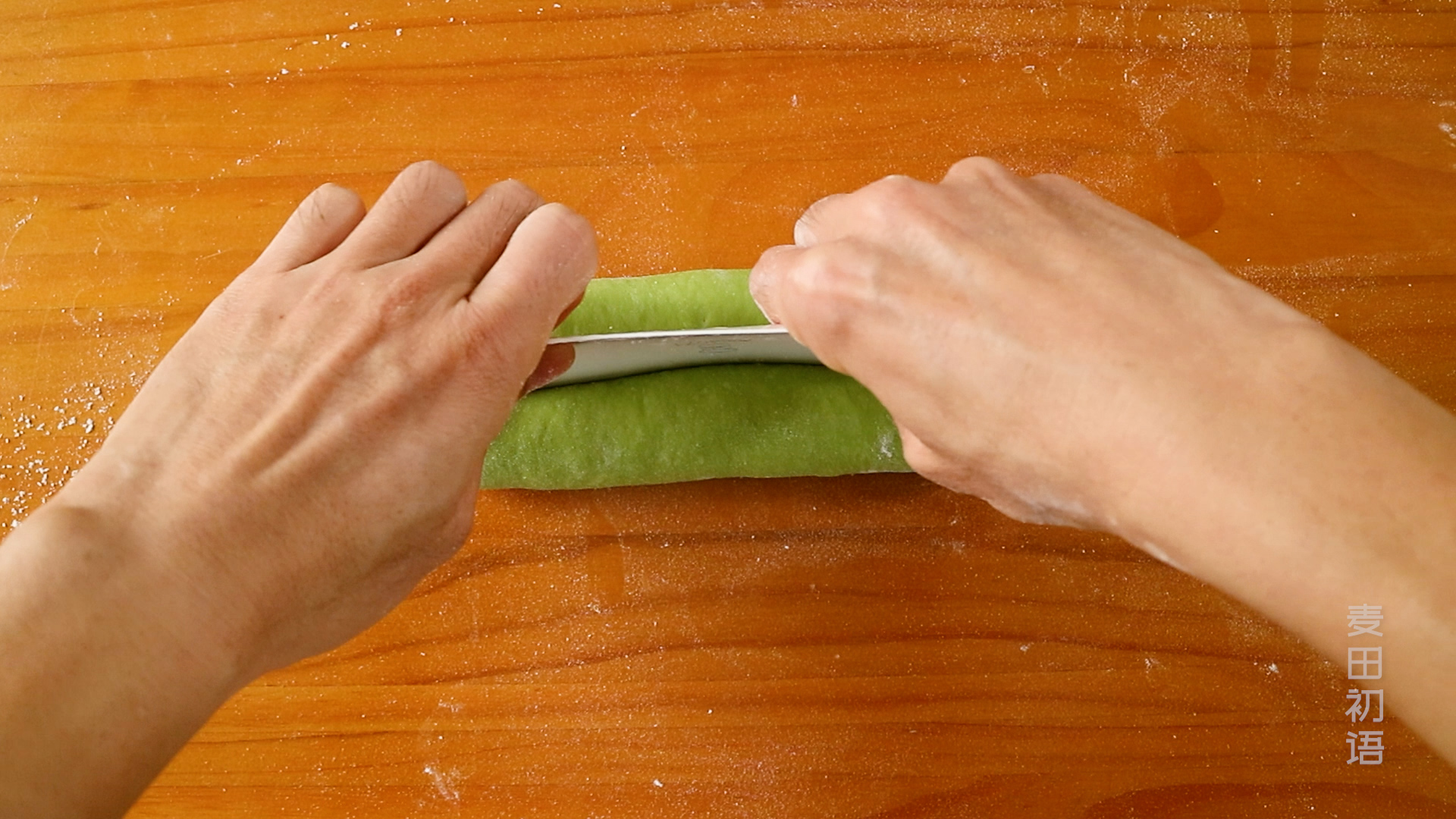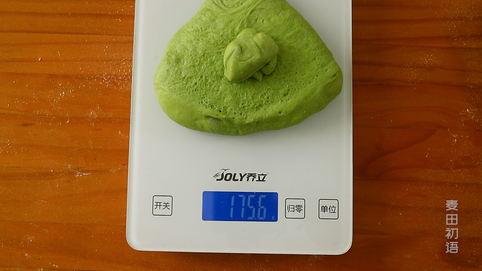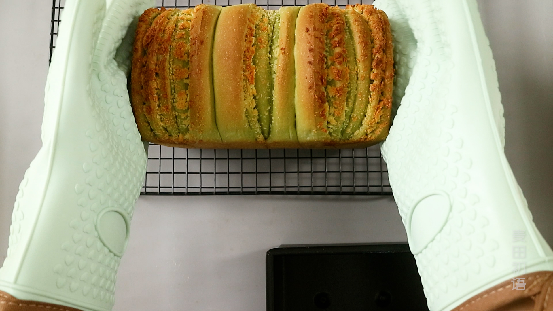 将面团送入烤箱底层,调整上火160度,下火180度,时长为26分钟。如果用风炉则145度26分钟,要根据你的烤箱温差灵活调整。要想保留更多的绿色,烘烤温度就不要设置太高。