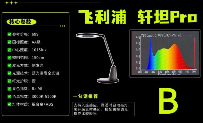护眼灯哪个牌子性价比高又好用?飞利浦轩坦Pro它采用台夹两用底座,可以夹在桌子边缘节省空间。灯臂有两处转轴,调节灯头角度和高度很自如。它的核心是面+环双光源设计:中心的圆面负责向下主照明,外面一圈环状光源通过侧发光提供补光,可以让桌面光线更均匀、减少阴影和明暗对比,实际光感确实比纯直下式的柔和一些。色温可以在3000K到5100K之间调节且显色指数Ra98,都属于不错的水平。功能上支持入座自动开灯和自动调光。不过,在护眼上比较中规中矩,存在较为明显的蓝光峰值。