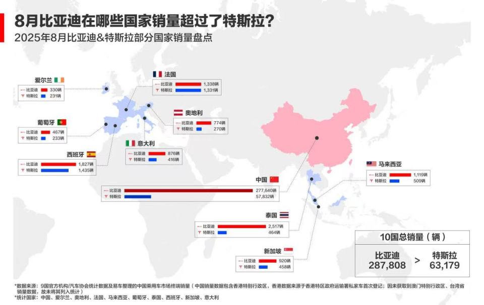 不光在全球总销量上厉害,比亚迪在海外市场更是一路高歌猛进,全球化战略那是完全奏效了。今年 1-9 月,海外销量直接突破 70 万辆。就说 2025 年 8 月吧,不管是西班牙、法国这些欧洲国家,还是新加坡、泰国这些东南亚国家,比亚迪销量都超过了特斯拉,在当地市场越卖越火,完全打开了局面。