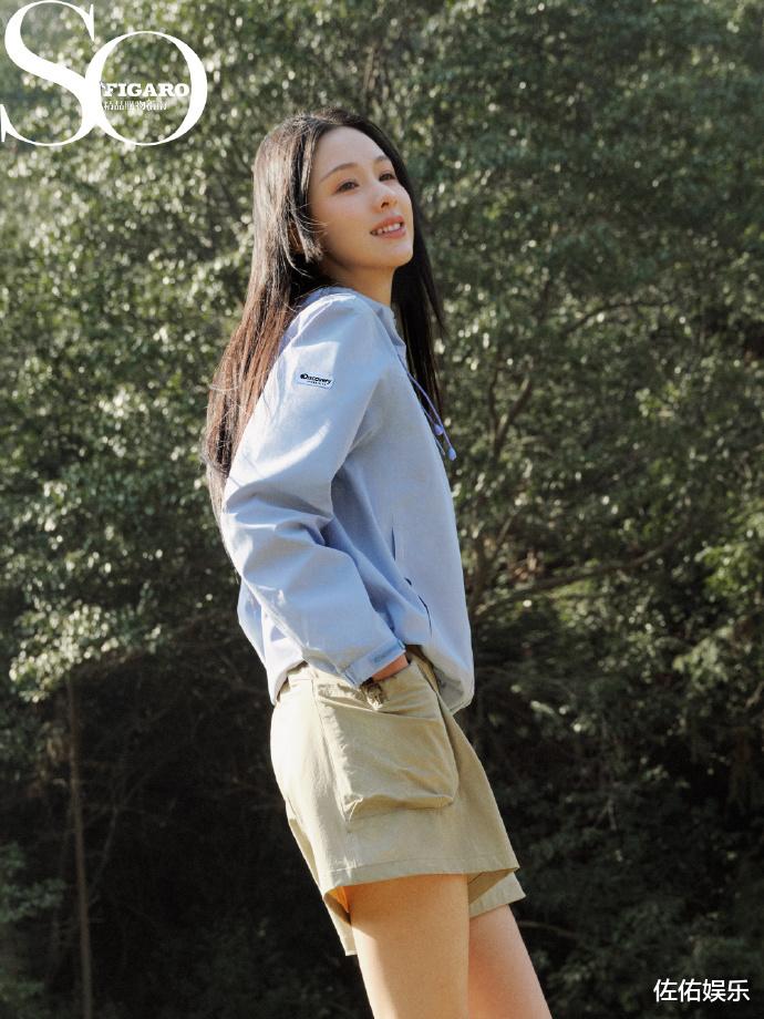 陈都灵穿着浅蓝色的连帽外套,搭配卡其色短裤,再穿着白色运动鞋,搭配印有字母图案的白色长袜,运动感十足。她双手插兜,身体微微侧立,头部扬起,眼神望向远方,仿佛在享受这片刻的宁静与美好,传递出一种悠然自得的情绪。