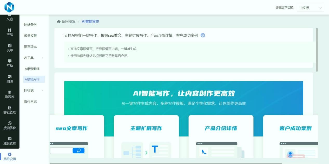 利用AI工具高效创作内容:乔拓云高级版及以上支持AI智能写作、多语言翻译、TDK生成,无需手动撰写产品简介、多语言内容,节省素材准备时间,同时提升内容原创度,适配AI收录规则。