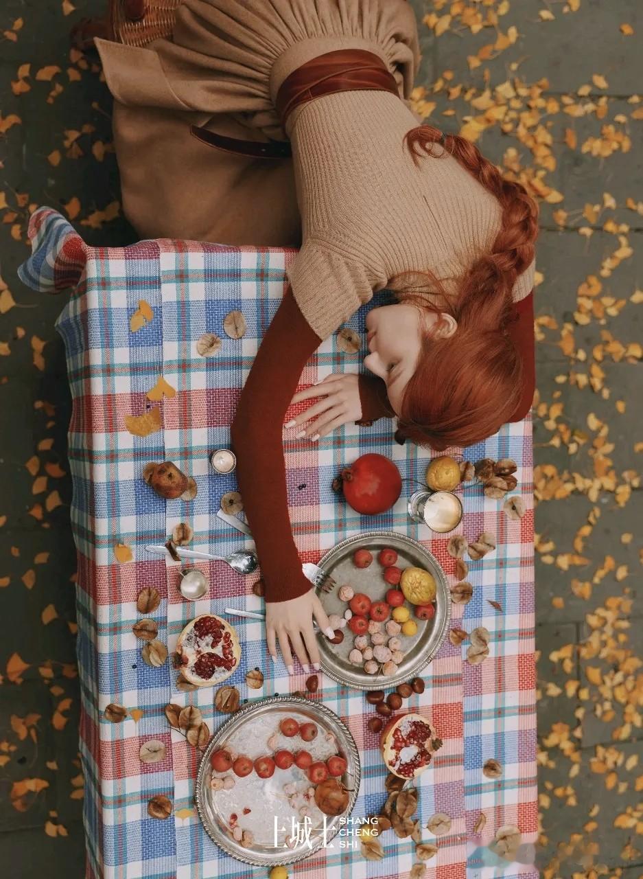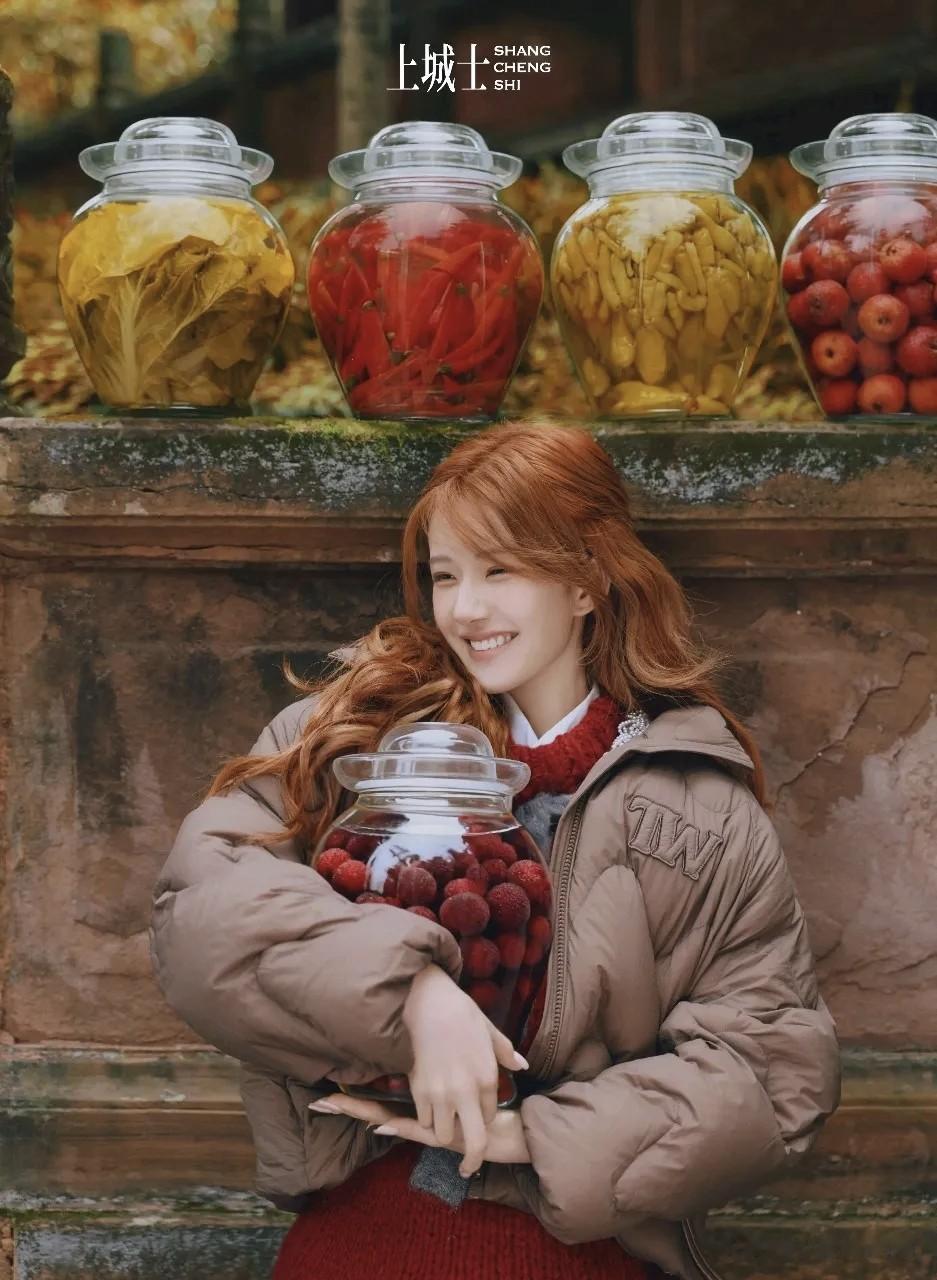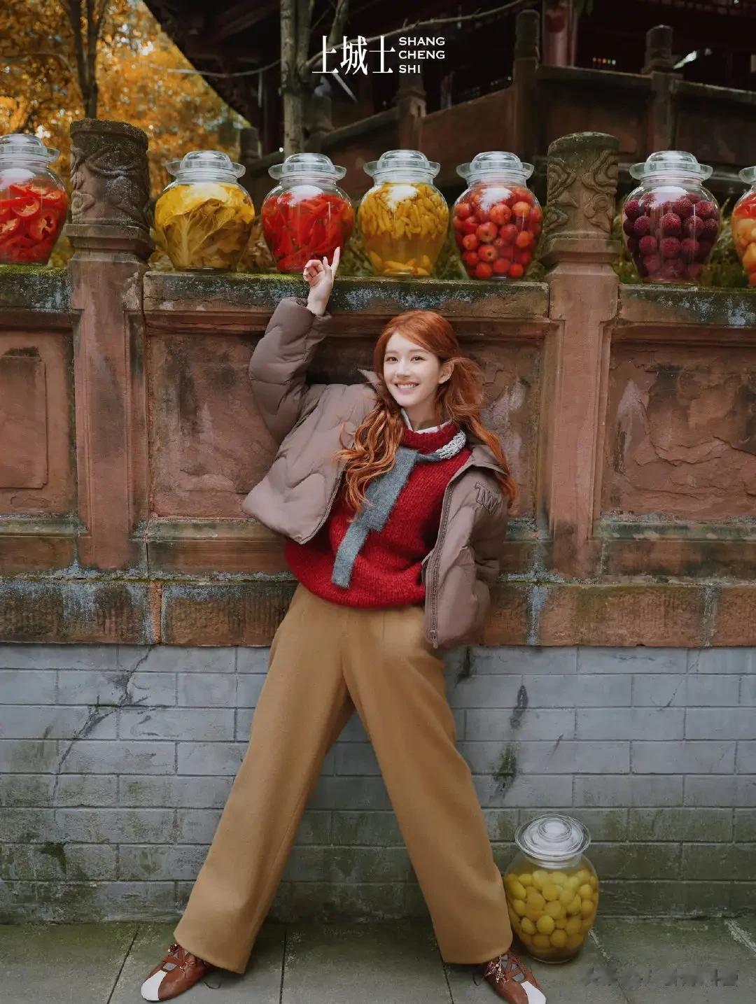 赵露思整个人散发着秋日里还不曾褪去的温热活力,身后老墙石栏上的泡菜坛子将四川本土的饮食文化与秋色紧紧的贴合在一起,赵露思的甜与泡菜的滋味激情碰撞。