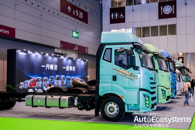 商用车展区,一汽解放、中国重汽、福田欧曼、陕汽重卡、东风股份、潍柴新能源、江淮1卡、比亚迪商用车、东风柳汽、宇通商用车、江铃汽车、载合卡车、九识智能等16家主流整车品牌携50+款热门车型集中亮相。
