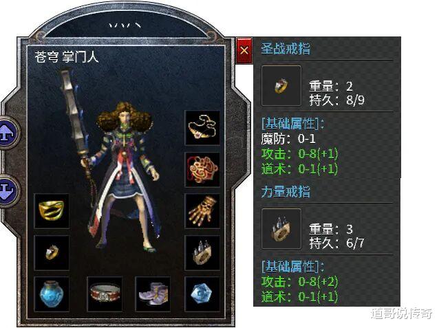 第三,戒指系列在戒指方面,这位战士也拥有不错的搭配,如上图所示,一枚是攻8道1的圣战戒指,另一枚是攻8道1的力量戒指,这属性是商量好的吧?强都强一块儿了。在戒指方面老百区的攻10圣战戒指似乎就没法被超越了,不愧是永远滴神啊。