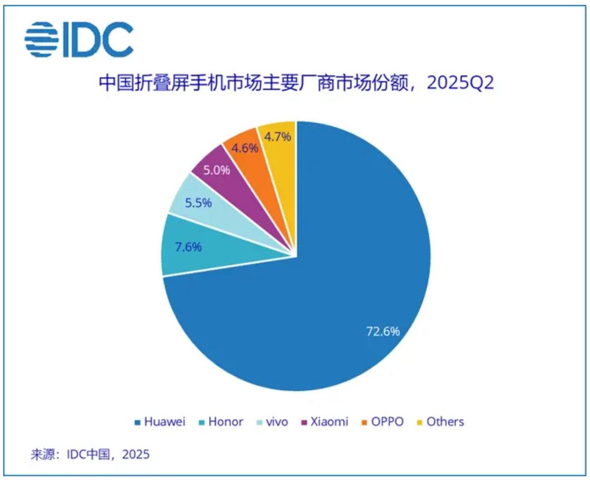 可以说,凭借在折叠屏领域深厚的技术积淀,华为Mate X6已然成为当下旗舰折叠屏的标杆之作。其全能的产品特性不仅赢得了丁禹兮、万茜、罗振宇等明星用户的青睐,更在市场上展现出强大的竞争力。IDC最新数据显示,2025年Q2华为以72.6%的市场份额实现逆势增长,这一压倒性优势已与竞争对手拉开显著差距,充分印证了华为在折叠屏市场的绝对领导地位。
