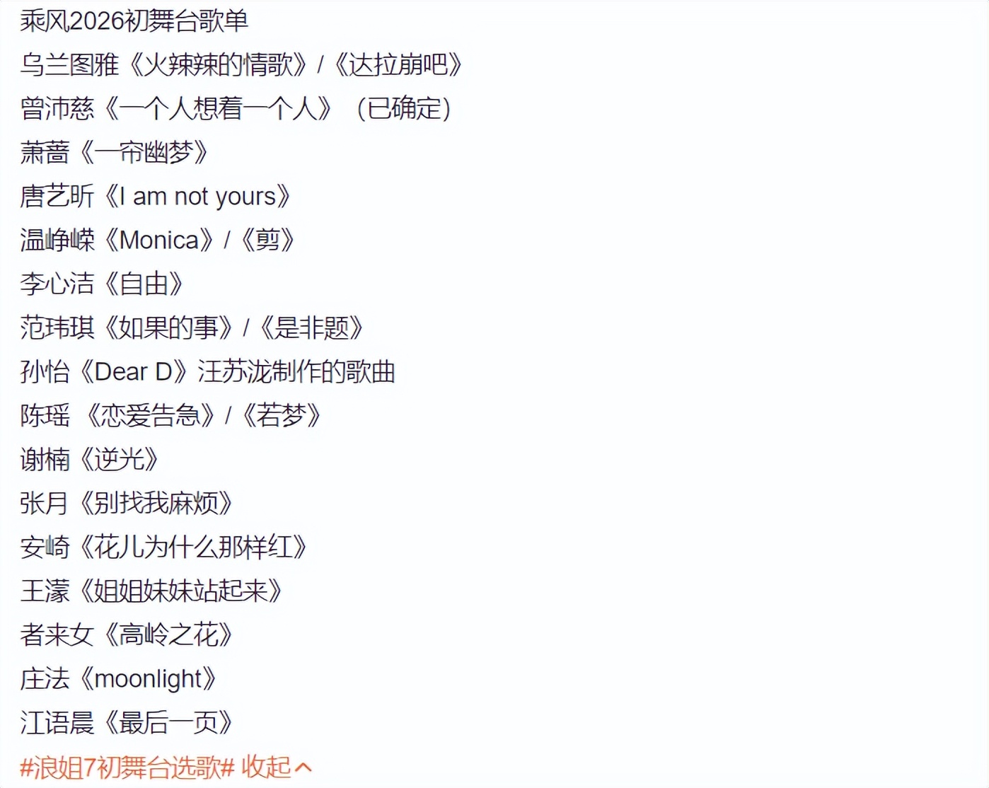 目前,姐姐们正在准备初舞台,大家都非常好奇,姐姐们的初舞台歌曲。接下来,我们一起看一看: