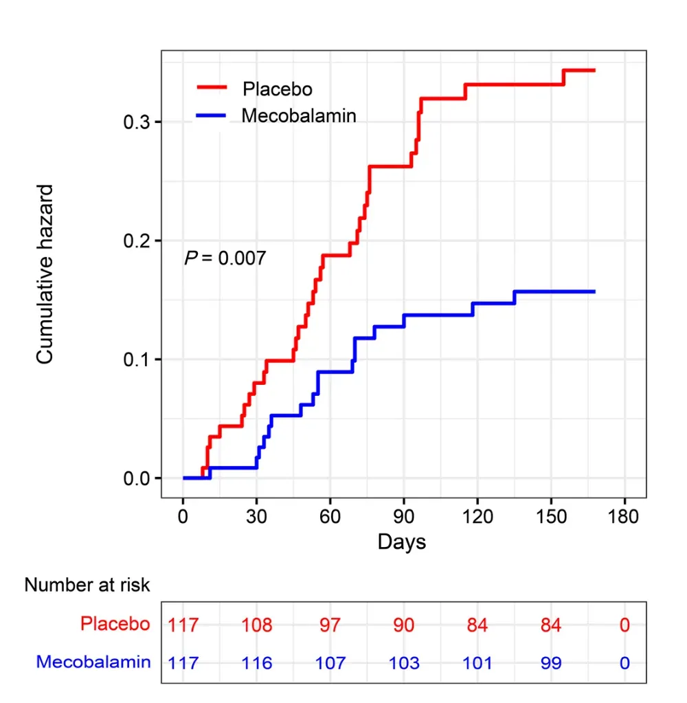 意向性人群显示,甲钴胺组17/117例(14.5%)首次出现≥2级手足综合征,安慰剂组34/117例(29.1%),未校正风险差−14.5%(95%CI:−24.9%至−4.1%),单侧P=0.003;校正激素受体与中心后,RR0.47(0.28–0.81),差值仍维持−14.1%。作者在讨论中强调,这一幅度“与celecoxib历史数据相当,却未增加心血管信号”,为临床提供了可口服、可长期、无额外安全顾虑的替代方案。