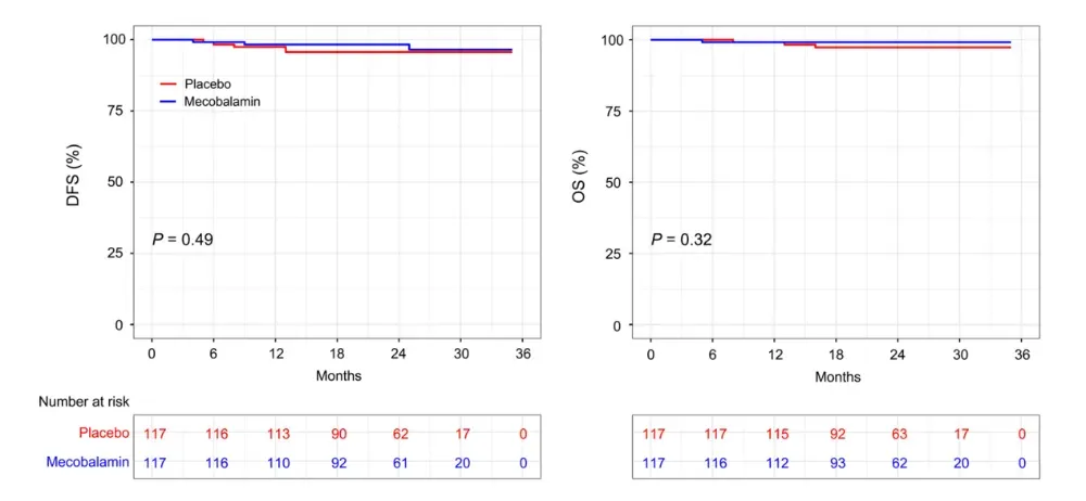 非HFS不良事件任何级别75.2%vs81.2%,≥3级10.3%vs15.4%;最常见≥3级为淋巴细胞减少(8.5%vs11.1%)。未出现甲钴胺特异事件,亦无心律、肾毒性信号。作者在讨论中特意对比CREATE-X与SYSUCC-001的毒性谱,指出“加用甲钴胺未额外增加血液或胃肠道负担”,并解释“口服0.5 mg tid血峰浓度远低于神经科高剂量方案,却足以产生临床获益”,为肿瘤科放心沿用该剂量提供药代依据(图4生存曲线无分离)。