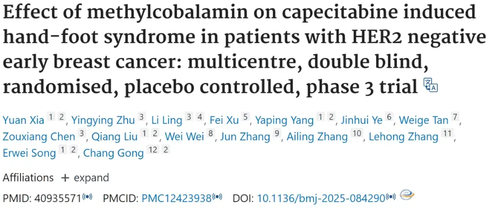 Xia Y, Zhu Y, Ling L,et al.Effect of methylcobalamin on capecitabine induced hand-foot syndrome in patients with HER2 negative early breast cancer: multicentre, double blind, randomised, placebo controlled, phase 3 trial. [J/OL]BMJ. 2025 Sep 11;390:e084290. doi: 10.1136/bmj-2025-084290. PMID: 40935571; PMCID: PMC12423938.