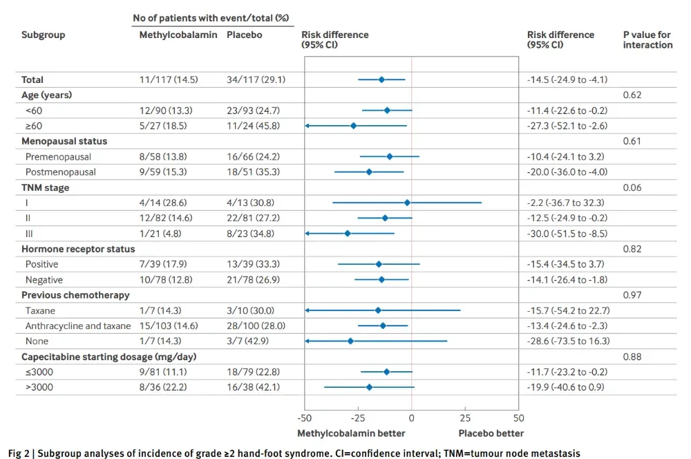 注:CI=置信区间;TNM=肿瘤-淋巴结-转移图中每行给出事件数/总人数(%)总人群、年龄<60/≥60、绝经前/后、TNM I/II/III期、激素受体阳性/阴性、既往化疗方案、卡培他滨起始剂量≤3000 />3000 mg/日等亚组均显示甲钴胺组事件率低于安慰剂组,交互检验P值均>0.05。