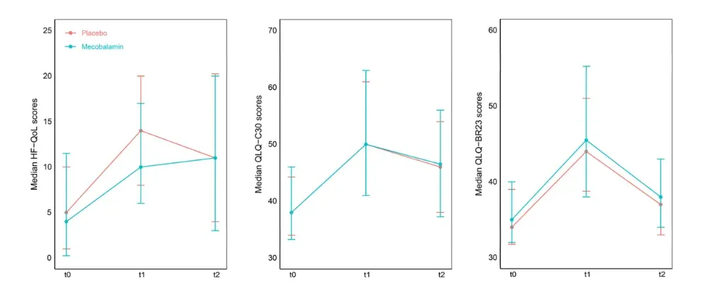 HF-QoL-18日常活动维度自基线至第4周期增幅中位数:甲钴胺6.0分对安慰剂8.0分,P=0.005;第8周期差异消失。QLQ-C30与QLQ-BR-23总分无组间差异。作者认为“早期QoL获益与2级事件减少时间吻合”,并引用D-TORCH试验类似现象——“多数严重事件集中在前4周期,一旦度过,患者适应性提高”,故前半程生活质量改善已具临床意义。