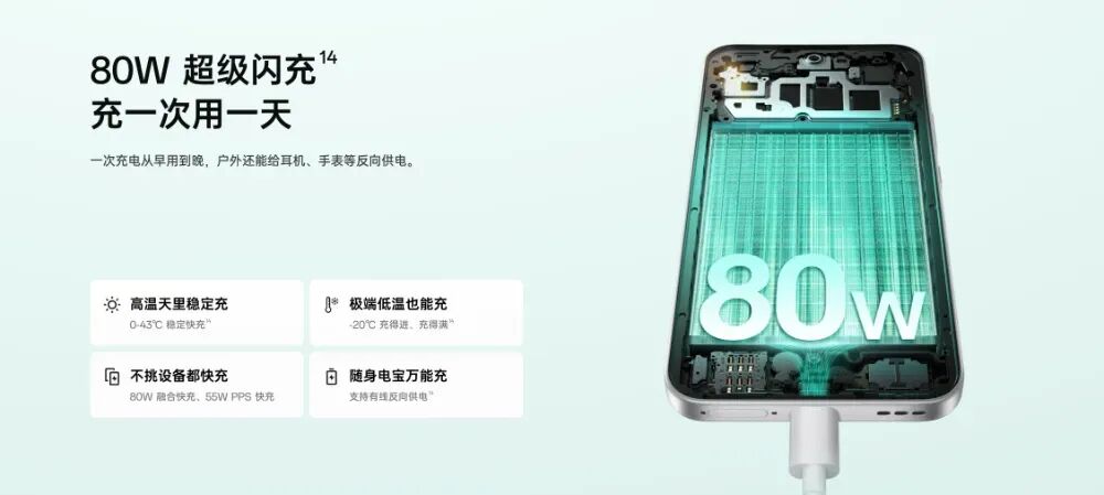 续航充电部分,内置7000mAh电池;支持80 W 超级闪充,80W UFCS 融合快充,兼容67 W 及以下超级闪充、44 W 三方 UFCS 融合快充、55 W PPS、13.5 W PD。