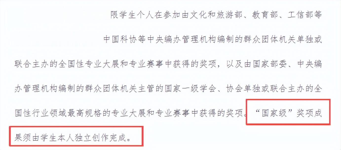 今年在此基础上又多了这些变动:“国家级”奖项成果、学术科研成果必须由学生本人独立创作完成↓。