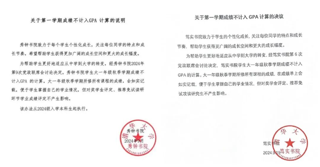 近些年对绩点的要求逐步放宽,去年9月,秀钟学院和笃实学院宣布学生第一学期成绩不计入GPA计算,不影响推免评定。