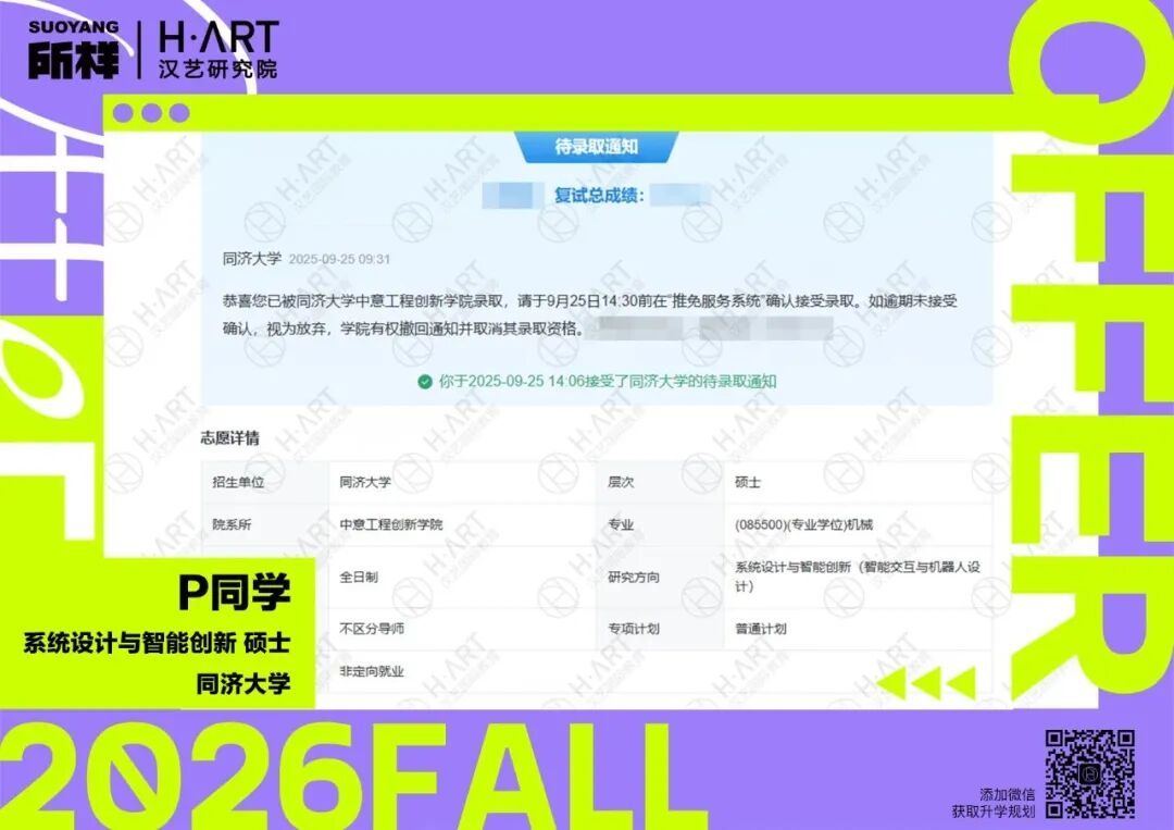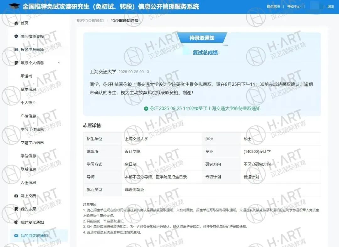 汉艺国际教育 Y同学 成功保研 上海交通大学 设计学院 设计学