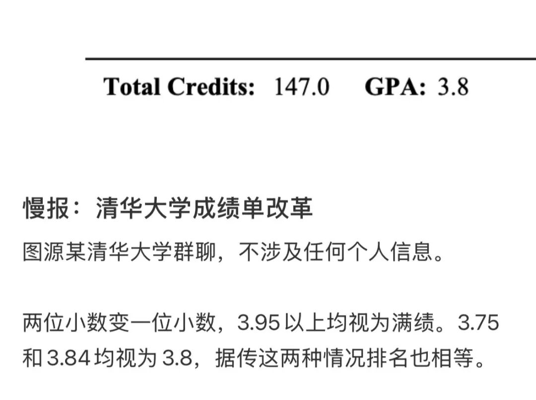 而在上个月,清华再次推行了更全面的绩点改革:将绩点小数点后2位,四舍五入到后1位,比如3.85和3.94都变成了3.9,绩点在3.95以上则被视为满绩。