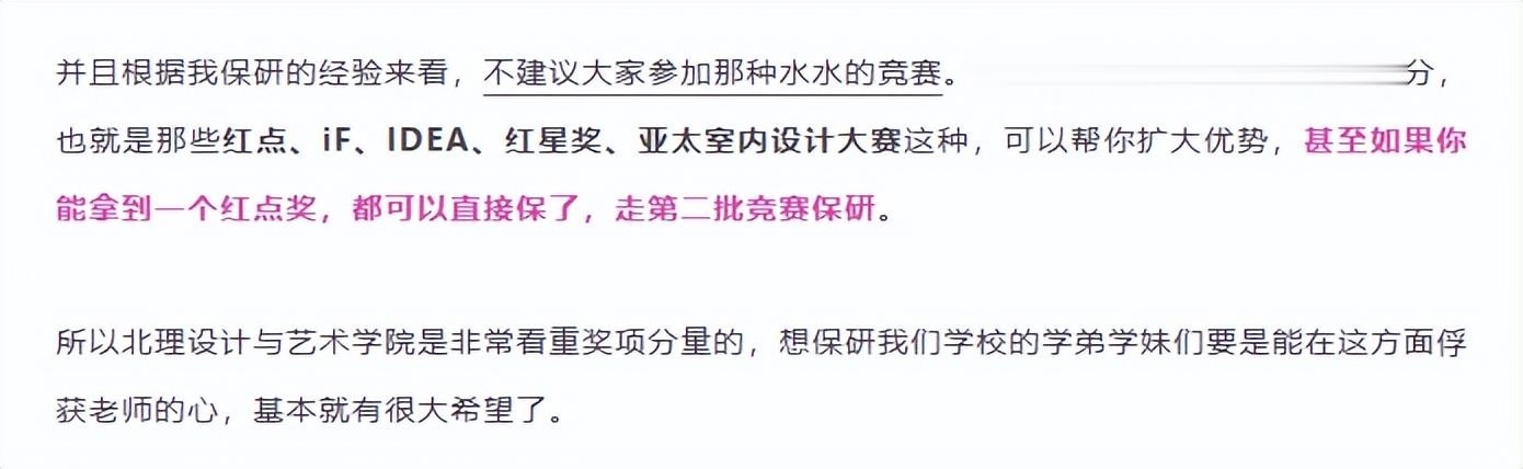 更值得关注的是,北理在材料审核、面试等各个环节都加重了对竞赛成绩的考察,比如红点、iF、IDEA等含金量高的国际大奖成为重要加分项。