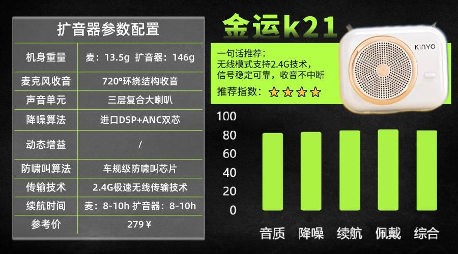 扩音器品牌排名前十名有哪些?金运K21在扩音器中表现突出,13.5g麦克风领夹佩戴轻盈,146g扩音器携带无负担。支持无线领夹/有线双模式,720°环绕收音全方位捕声。顶配三层复合大喇叭音质好,进口DSP+ANC双芯滤杂音,车规级防啸叫芯片防啸叫。2.4G无线40米传得远且稳,续航8-10小时。Type-C充电快,接口兼容广,模式丰富适配多场景。