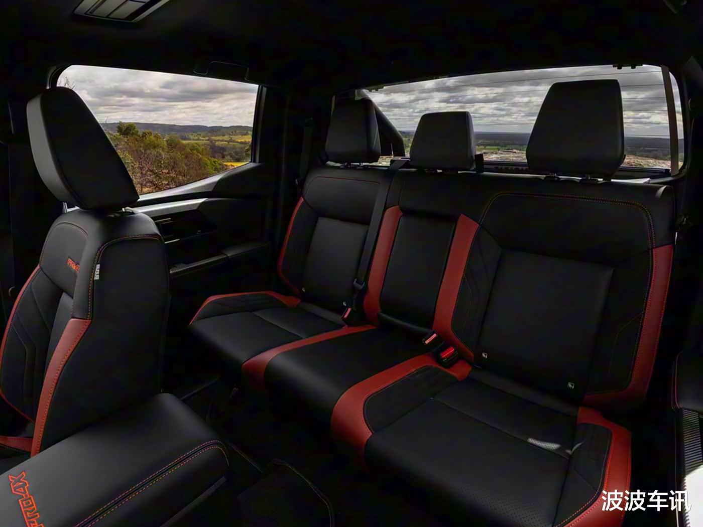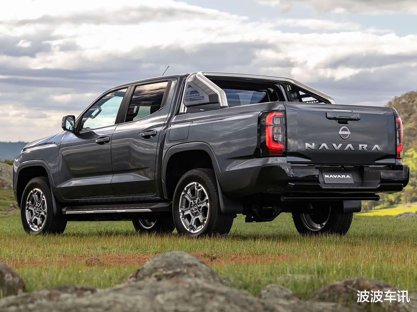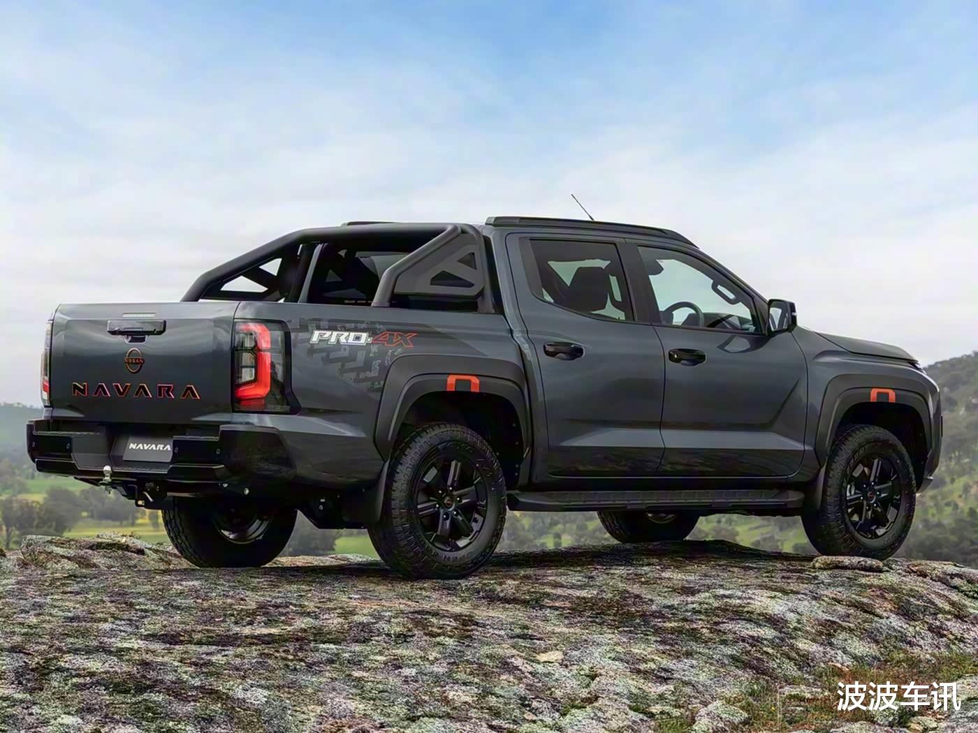 在车身的侧面,新车采用的是非常粗犷的效果打造,它有一个硬气的车身设计,车身侧面的中间还有肌肉感很突出的腰线,车顶有行李架。新车的底部是硬气的包围,双轮眉采用了梯形的轮廓,增加了硬派感,它还有突出的脚踏。这款专属的顶配PRO-4X版本的后车斗的上方还有专属的龙门架,硬派效果也因此增加了很多。