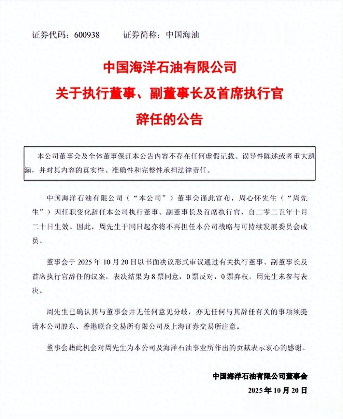 10月20日,中国海油(600938)公告称,公司董事会谨此宣布,周心怀先生(“周先生”)因任职变化辞任本公司执行董事、副董事长及首席执行官,自二零二五年十月二十日生效。因此,周先生于同日起亦将不再担任本公司战略与可持续发展委员会成员。
