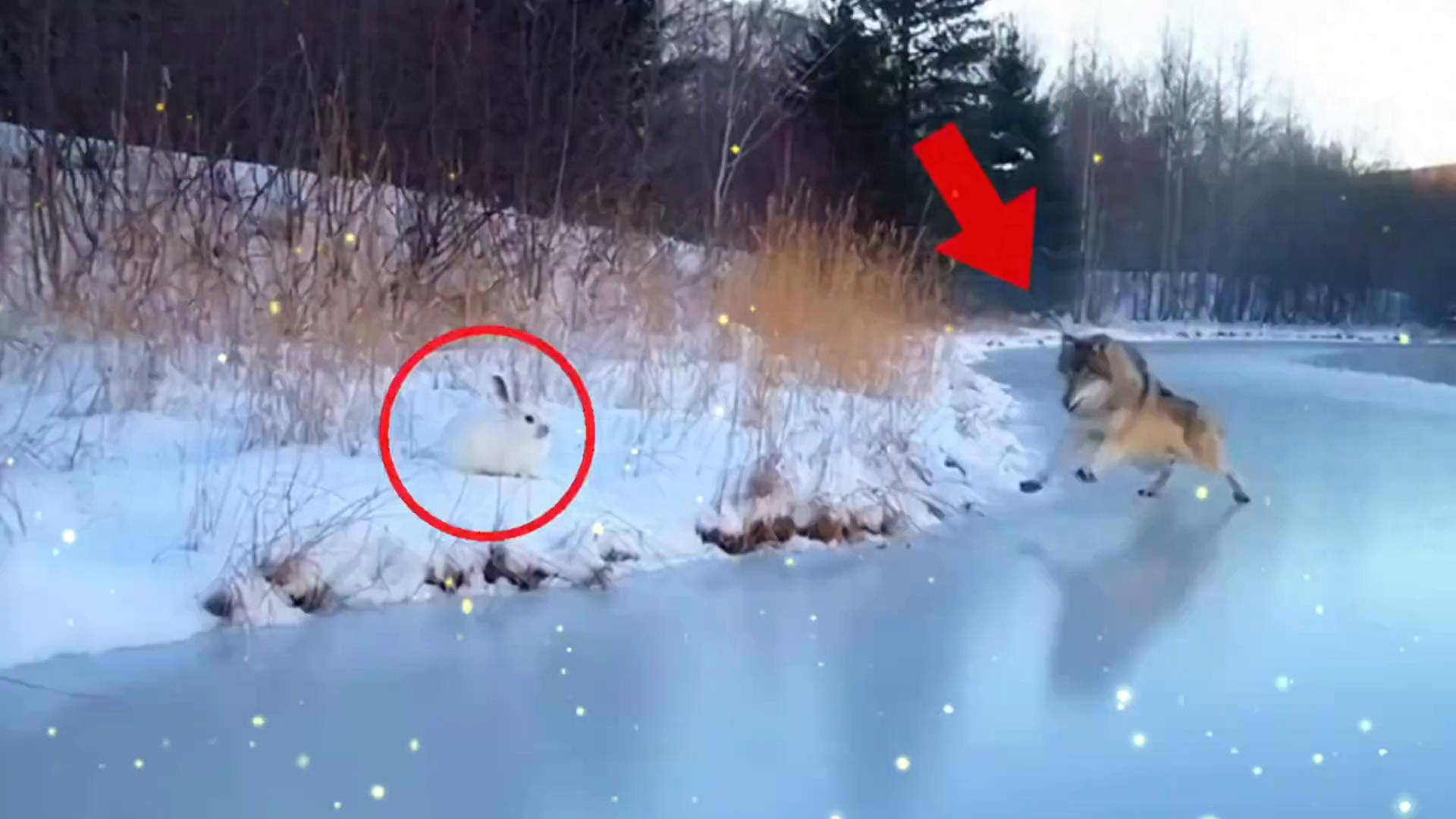 ·狼想去抓捕前面的野兔,不料一个冲刺滑倒在野兔前方。野兔本以为自己伪装很好没被发现,结果发现不对劲,吓的赶紧逃命,狼却急的怎么也站不起来。