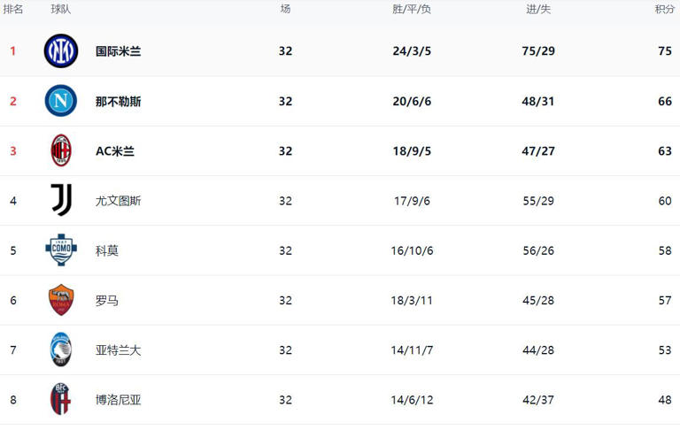 在积分榜上,国际米兰遥遥领先。国际米兰24胜3平5负,拿到75分。而本轮那不勒斯和AC米兰都丢分了,让国际米兰的优势继续扩大。那不勒斯66分排名第2,落后国际米兰9分。AC米兰只拿到63分,排名第3。尤文图斯60分,排名第4。科莫输球后依然是58分,无缘超越尤文图斯,排名第5。罗马以57分排名第6。第7的是亚特兰大,拿到53分。