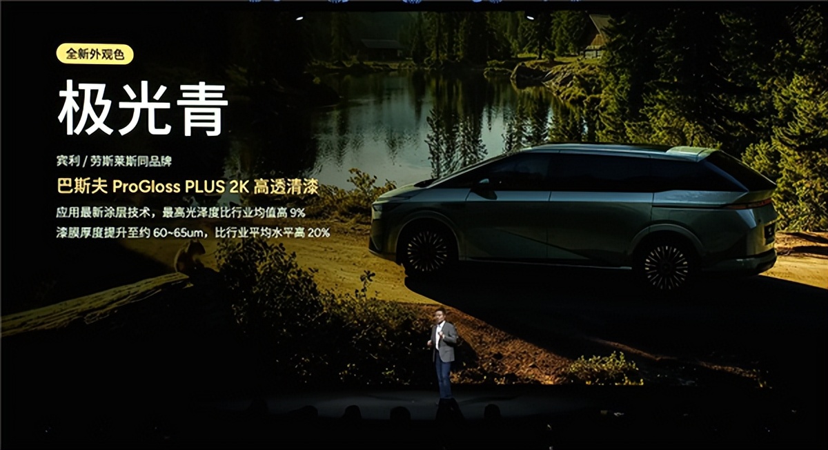 增程版采用了和纯电类似的设计,整体棱角分明,很有赛博未来感,配有主动进气格栅,可优化风阻,提高续航,并提供极光青配色,采用宾利、劳斯莱斯同品牌巴斯夫高透清漆。