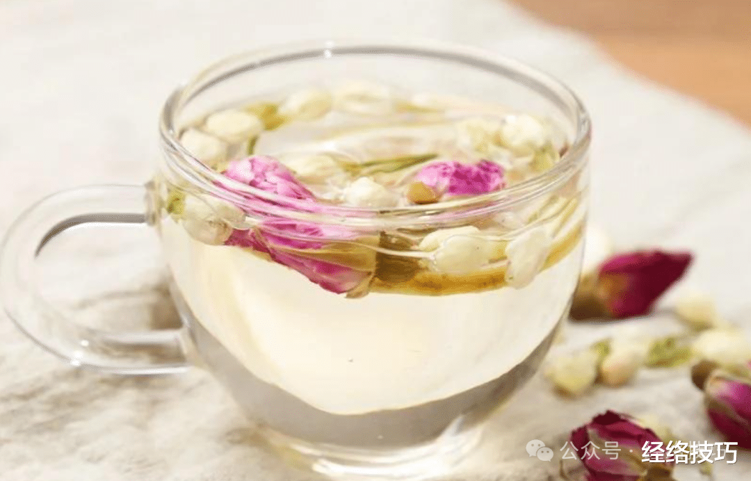 干玫瑰花5朵,干茉莉花5朵,还可以加5粒枸杞来滋肝阴,或者1枚红枣补脾养血,让茶的性质更平和。