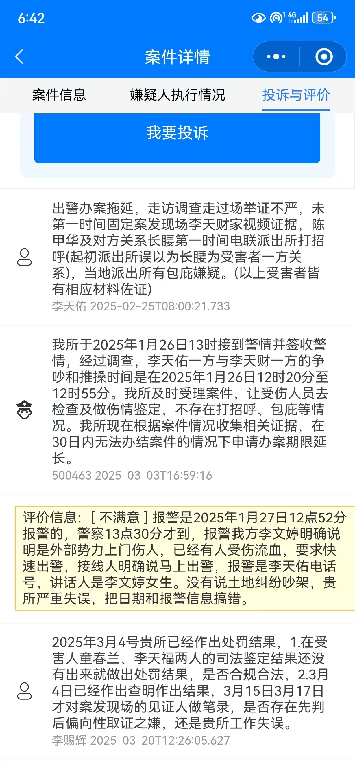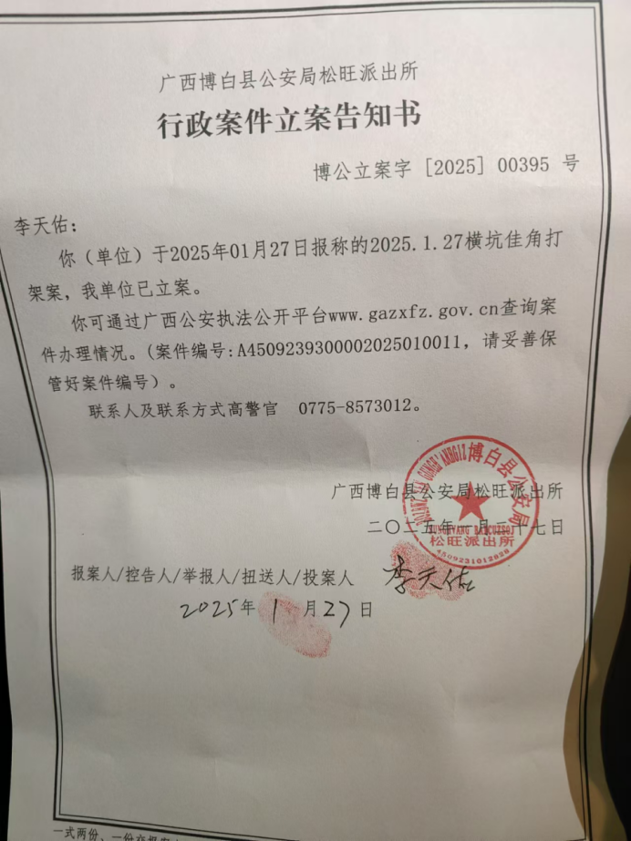 李赐辉认为对方是基层宗族黑恶势力,当地警方有包庇嫌疑,先后通过多个网上平台投诉举报。3月28日,博白县公安局工作人员向李赐辉电话反馈称,督察大队到当地派出所督察后,把案卷交给县公安局法制大队阅卷。