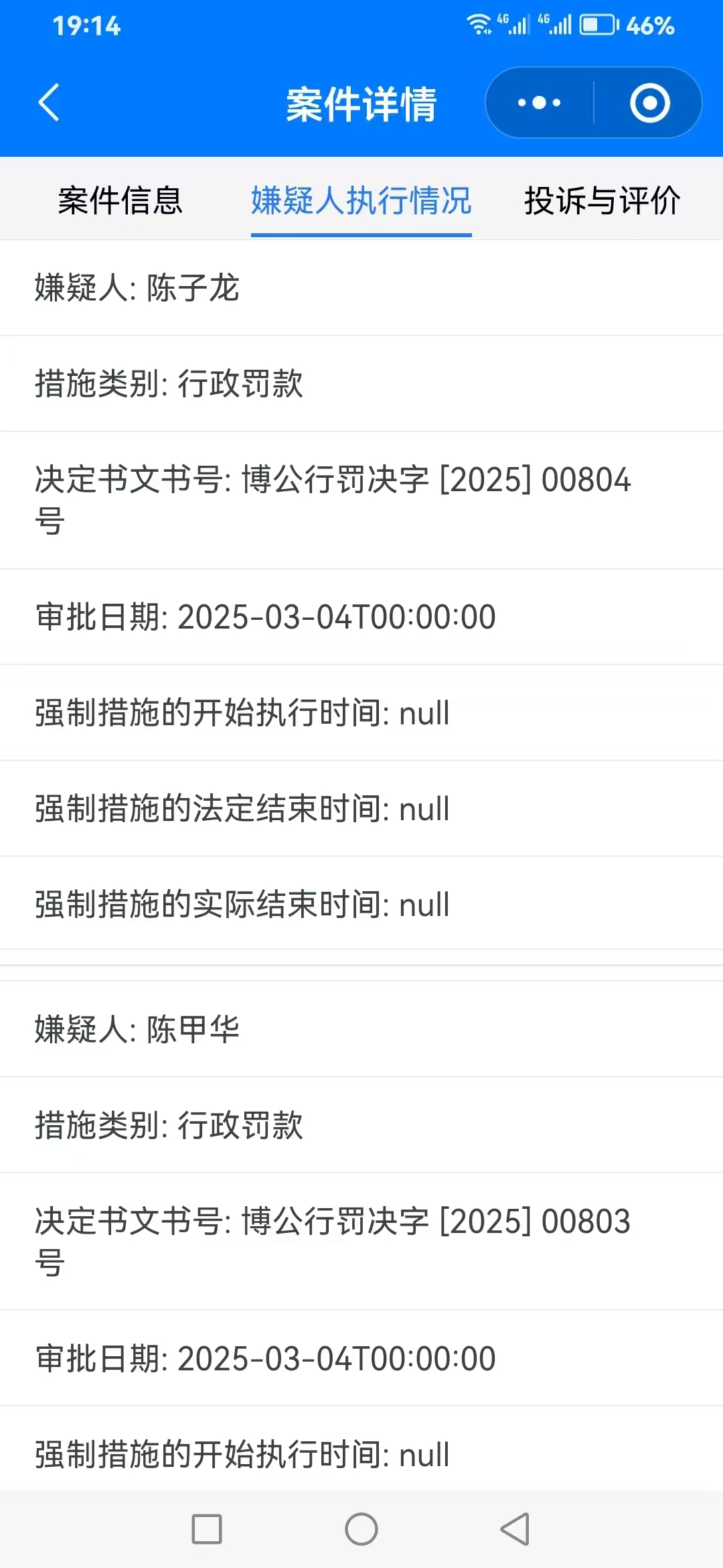 当天事发后,博白县公安局松旺派出所按行政案件立案。《八桂警察阳光执法网》显示,3月4日,陈某华、陈某龙等为首人员受到行政处罚,罚款500元。