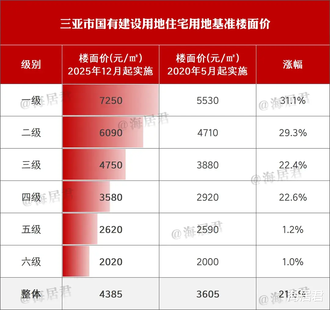 三亚动作极快!12月18日海南自贸港封关,12月19日就公开了国有建设用地最新基准地价!各级别住宅用地价格全面上涨,整体涨幅超20%!