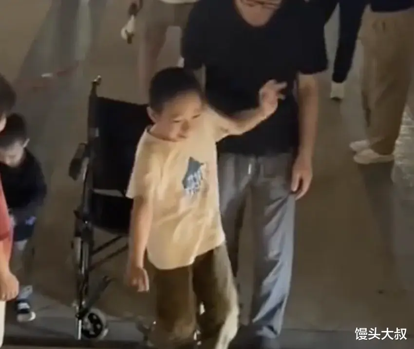 视频中,一位患有脑瘫的小男孩在父亲的搀扶下。
