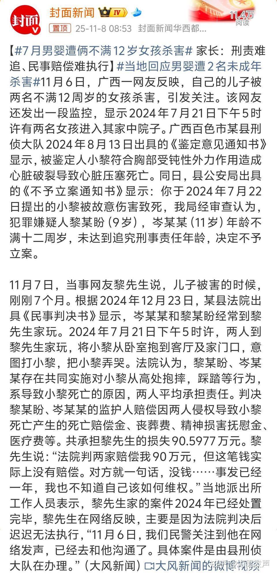 事发经过: 2024年7月21日,这两名不满12岁的女孩进入黎先生家中,将7个月大的小黎从卧室抱走,并实施了“从高处抱摔、踩踏”等行为。