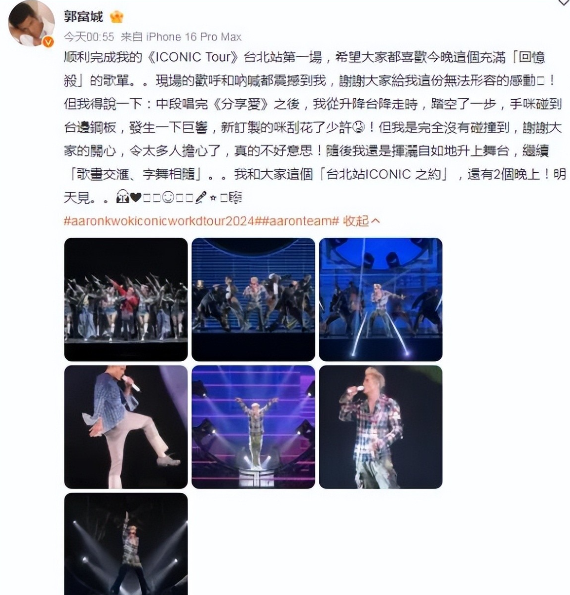 当时也是升降台突然下降,好在他只是踩空,并未像郭富城一样掉下去。
