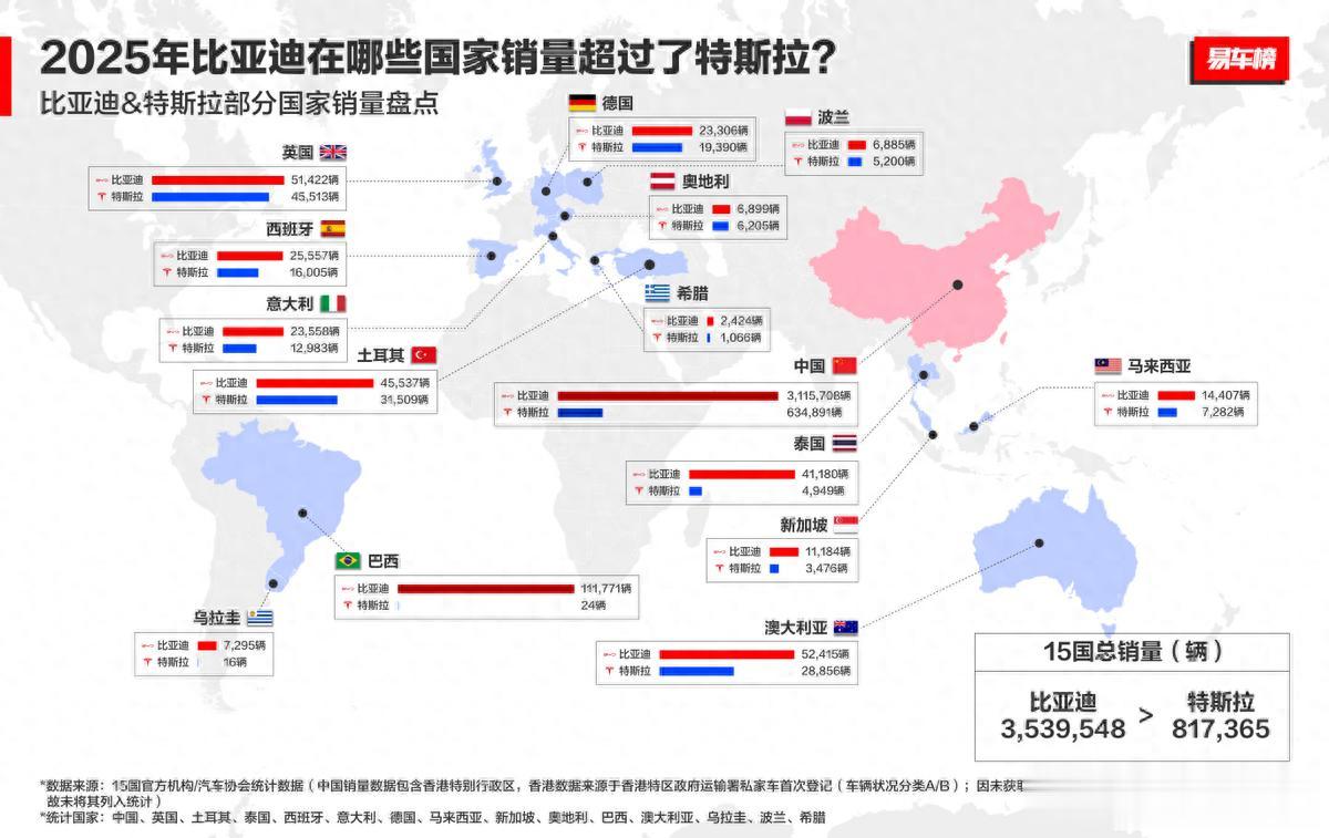 这份硬核实力,在全球各大市场迎来全面验证。欧洲赛场,比亚迪完成从单品切入到体系突破的升级:英国年销超5万辆、同比激增485%,德西意等传统汽车强国销量均破2万辆,本土化销售服务网络成为破局关键。亚太市场优势更显著,土耳其、泰国销量分别达4.5万、4.1万辆,泰国本土工厂筑牢市场主导力,新加坡、马来西亚销量更是特斯拉的2-3倍。南美巴西市场,比亚迪年销超11万辆登顶纯电销量榜首;澳洲市场年销破5万辆,成功跻身品牌销量前十,尽显适配不同发展阶段市场的全能竞争力。