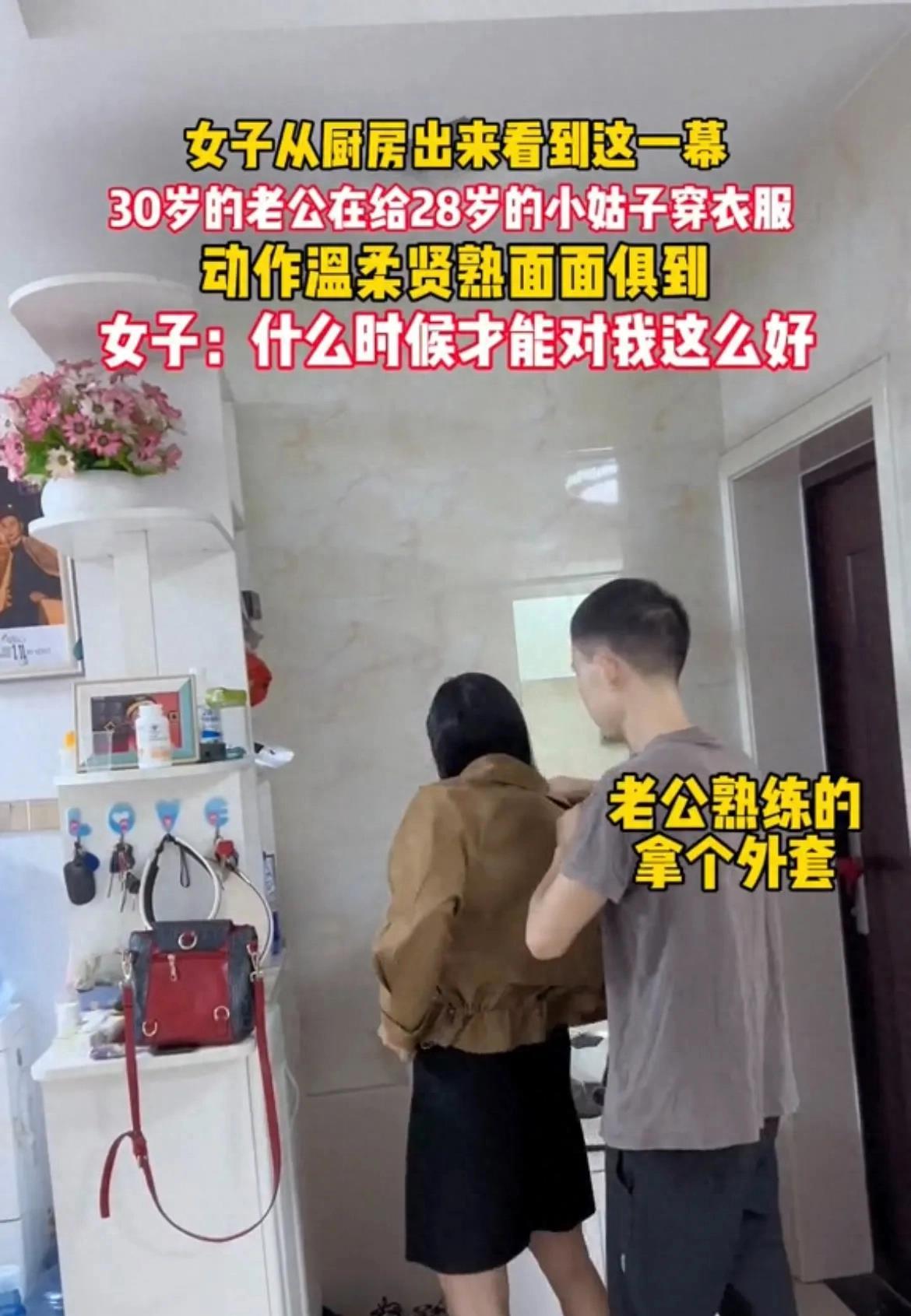 小姑子刚走到门口,伸手拿外套时,女子的老公早已经帮她拿到衣服,还动作娴熟得帮她穿上。