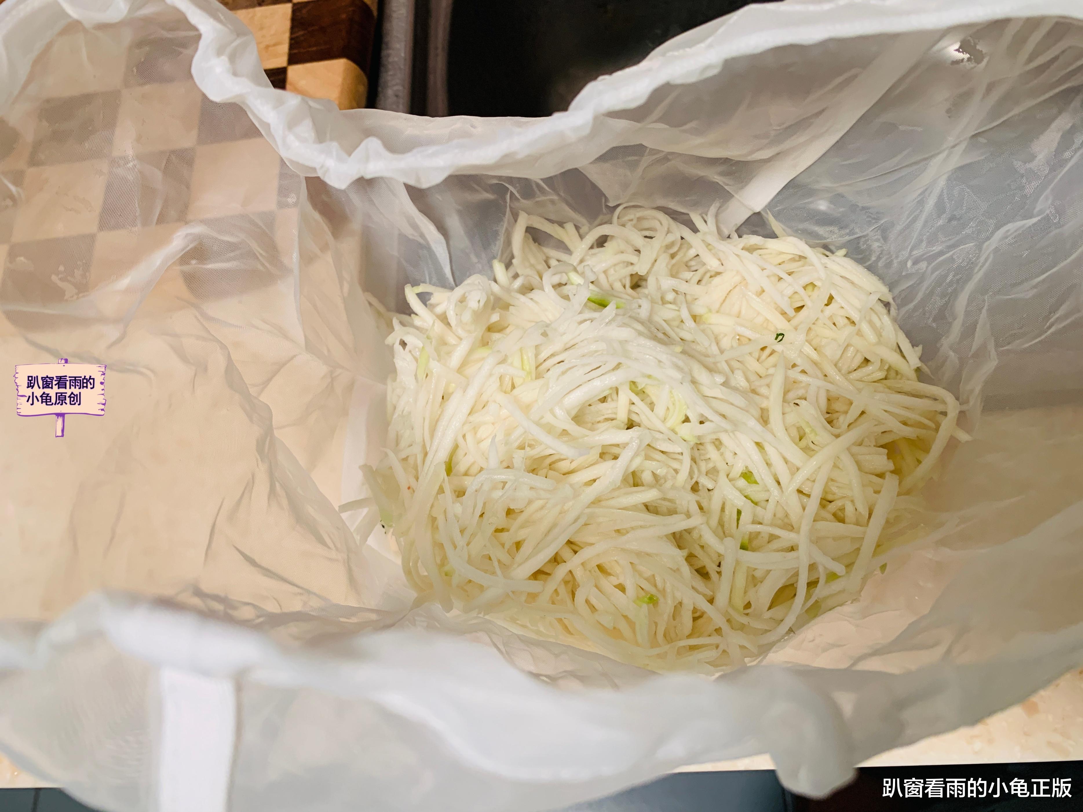 4:将杀好水的芥菜丝分批放入挤水袋中,用力挤干水分。(或者用重物压上,再静置三个小时,让其充分析出水分。)