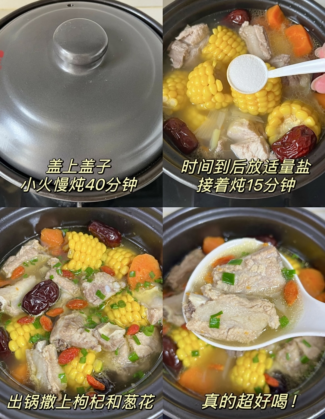 大火把汤烧开后,转小火盖上盖子慢炖40分钟。这期间完全不用管它,该追剧追剧,该做家务做家务,厨房里飘着淡淡的肉香和玉米甜香,等着就行啦~ 最后10分钟的时候再加盐和少许白胡椒粉调味,搅拌均匀后再炖一会儿,让味道渗透进去。这里又一个小技巧:盐一定要后放,过早放盐会让排骨的蛋白质凝固,不仅炖不软烂,汤的鲜味也会大打折扣~