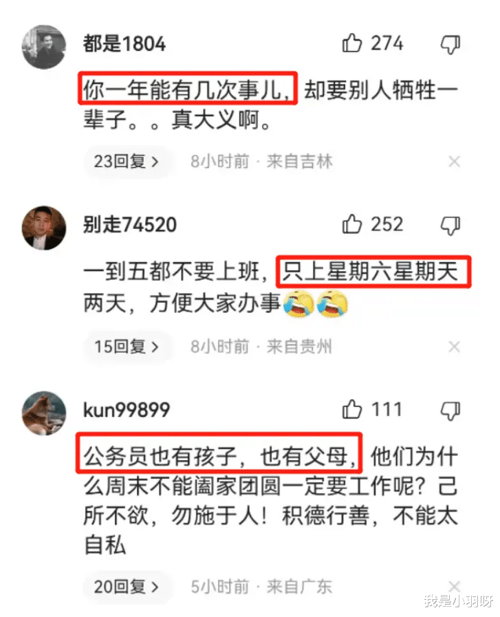 吉林网友说:“你一年能办几次事?却要别人牺牲一辈子的周末,真够大义的!”