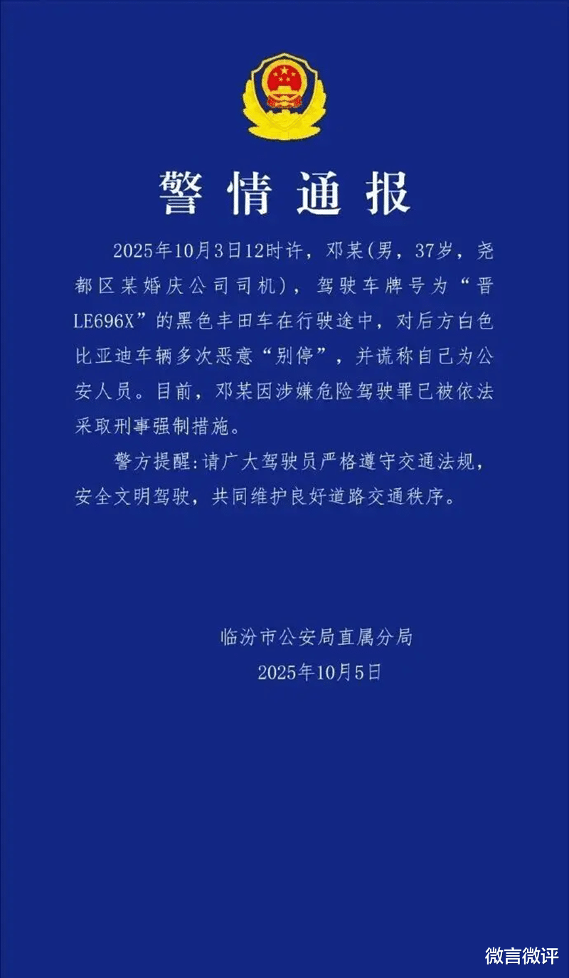 大前天的中午,山西临汾市尧都区一家婚庆公司的邓姓司机,开着一辆黑色的丰田车,多次对后方正常行驶的白色比亚迪恶意别停。