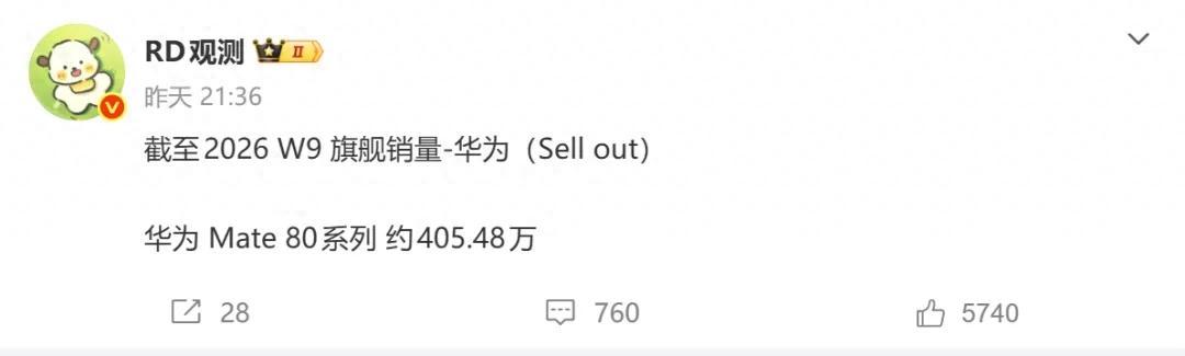 根据RD观测发布的数据,截至2026年W9(2026年第九周2月23日到3月1日),华为Mate80系列的销量正式突破400万台,达到405.48万台,相比W8周再次增加27.5万台,延续了2026年春节假期前的强势势头。