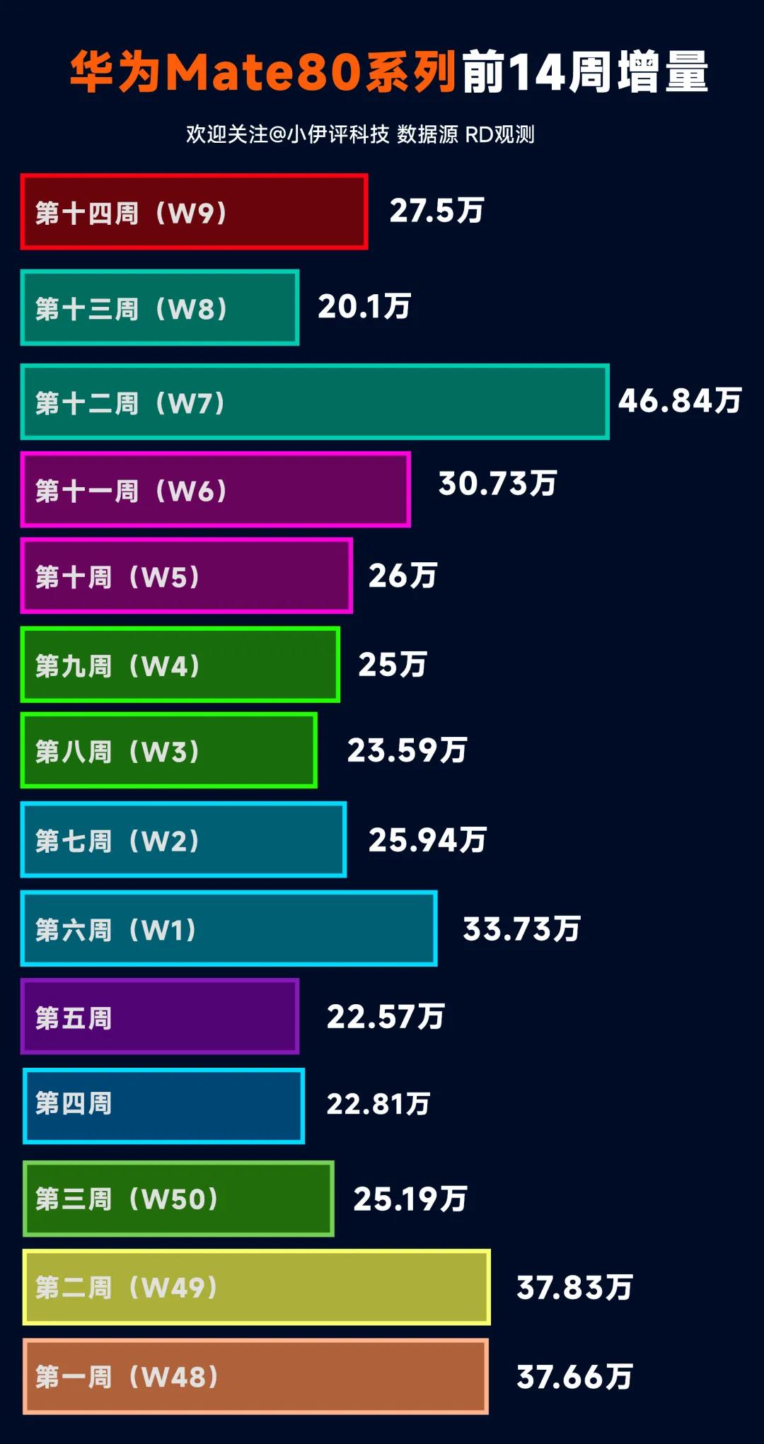 我呢也给大家罗列了一下华为Mate80系列在前14周的增量情况,属实是太猛了,从发布到现在已经连续14周销量突破20万台了。