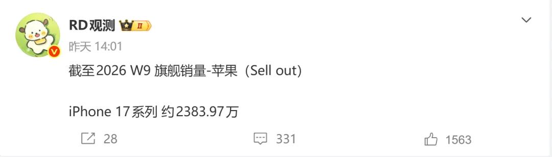 iPhone17这边,根据RD观测的数据,总销量也已经达到了2383.97万台,相比W8新增92.45万台。