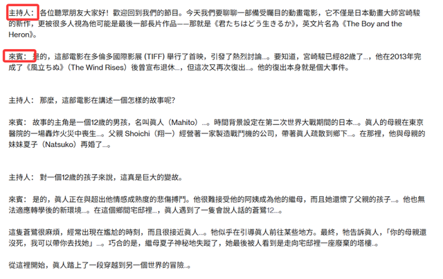 比如,播客是主持人讨论第三方作品,换成宫崎骏采访宫崎骏,一些人称(如「他」)就要修改;去掉一些外语,避免后续中文音频中出现怪异的读音。