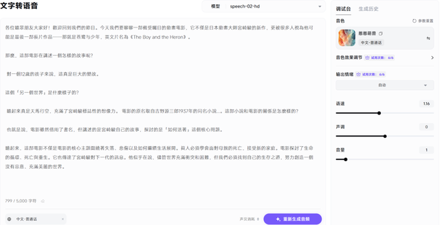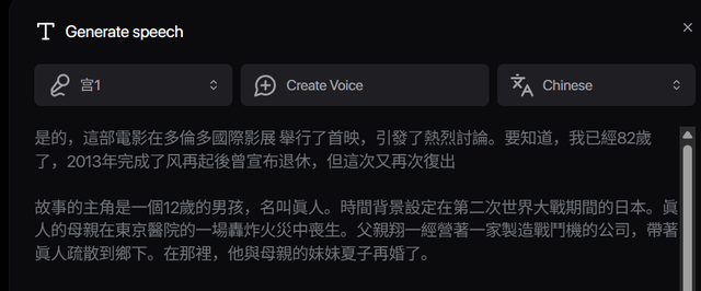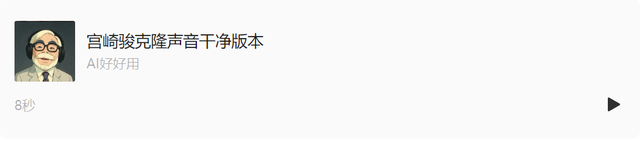 虽然远称不上「神还原」,但和现成 AI 工具自带的那些声音一比,还是强不少的。不过嘛,也有明显短板:语气听起来像在念稿子,总感觉有点播音腔,不太像真·对话。但你懂的,在目前这个阶段,能让「老年宫崎骏」说中文、还听得过去,已经挺不容易了。