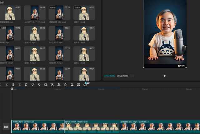 最后一步,就是剪辑环节啦!打开剪映,把刚刚生成好的视频导入——比如,按照脚本,把 Baby 宫崎骏视频拆成小片段,保存好;继续切分老人宫崎骏的视频。