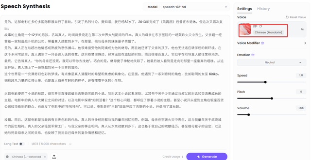 Hedra 虽然支持文字转语音,但用在中文上效果很差。这时候,就轮到最近屠榜的语音生成神器——MiniMax Audio登场了。一番对比后发现,它家的声音质量真是嘎嘎在线。比如 Baby 宫崎骏这段,我们直接把脚本扔进去,选择「涵涵萌兽」的童声模型,几秒钟就生成一段自然又灵动的童音。