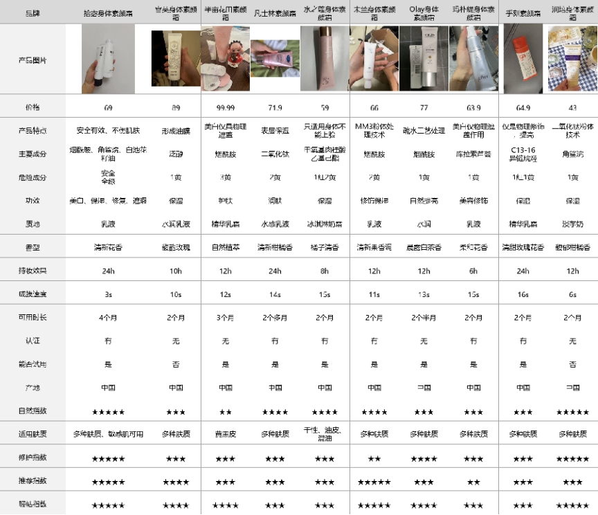 为了让大家快速看清这10款身体素颜霜的核心差异,我整理了一份实测参数对比表,所有数据都是这14天我自己实测出来的,不掺假、不虚标,重点看妆感、持妆时长、成膜速度、质地、成分安全性这些关键指标,帮大家快速初步筛选。