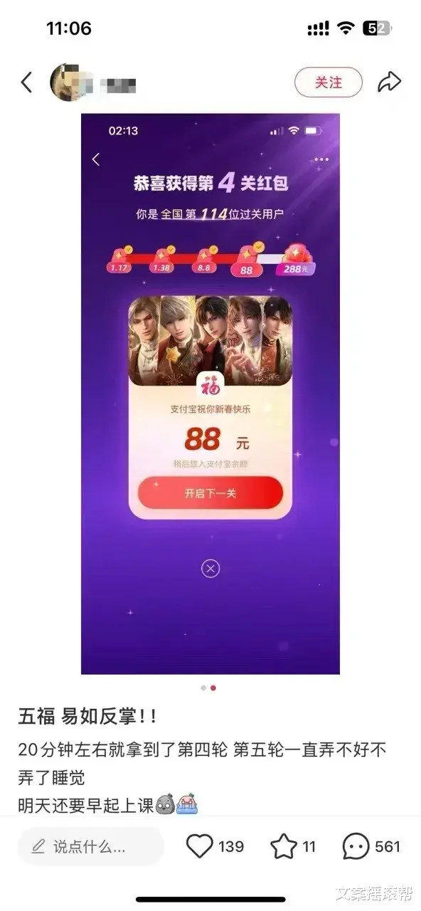 4 说真的,我集福是真的有那么一丝期盼自己是个天选之子,领到个大的。就像过年放开门炮,我爹六十多岁,大年初一早上四点爬起来去震一下。万一今年发财了呢?
